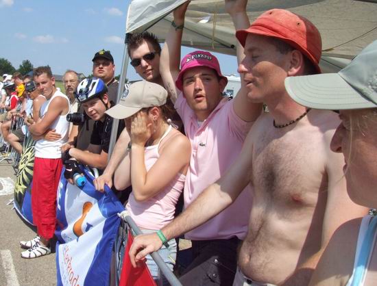 Ik was vol op TV, niemand mij gezien? Ik stond op de top van de Côte de Trintelen, echt gaaf. Leuk spanning opbouwen, eerst kwam die hele caravaan langs en ik dacht: ah, kom maar op met die PMU-handjes, dan ga ik daarmee wapperen, maar die kwam niet langs Wel scoorde ik een Champion-pettetje van de Bolletjestrui ![]() Daarna een half uur wachten, zie je de helikopters overvliegen, komen motoren langs, ploegleiderswagens enzo scheuren naar boven en dan de eerste renners.. Het peleton flitst voorbij met Hushovd in het geel, dat valt op. Boogerd wordt aangemoedigd en dan is het wachten op de achterblijvers. Echt mooie sport, die jongens zwoegen in de hitte, komen bijna niet vooruit en worden door het publiek opgezweept. Niemand gaat weg, iedereen wacht op de bezemwagen. Pozato zag ik geloof ik achterin bungelen. Geweldige sport, dat wielrennen! Ik heb het eens eerder meegemaakt op Les Deux Alpes in 1998, maar toen regende het keihard en was de sfeer heel anders. Wat mij betreft elk jaar een etappe hier