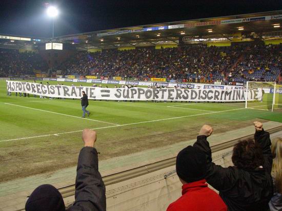 Dit stond er op. Actie van NAC-aanhang tegen de pasfotoregistratie van de uitkaart én de seizoenkaart die de KNVB wil invoeren. Zij vroegen van al onze supportersverenigingen 5 man die mee wilden doen. Bedoeling was om het hele veld ermee rond te lopen (en we oogsten van alle tribunes applaus) en daarna de spelersopkomst een minuut lang te blokkeren om landelijke aandacht te krijgen. Helaas werkte Talpa niet echt mee want de opstellingen werden er gewoon overheen geprojecteerd. Stond ik daar op 5 meter van Pierre, heb nu spijt dat ik m niet even een been heb gebroken, hehe