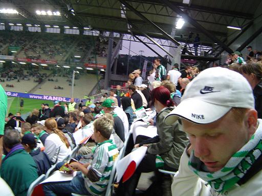 In Wenen ben ik zondagavond naar Rapid Wien-Grazer AK geweest. Leuk om eens mee te maken. Ik wist helemaal niets van het Oostenrijkse voetbal, verwachtte eigenlijk een beetje 1e divisie-idee, weinig toeschouwers, slecht voetbal. Dat laatste was zeker zo, maar dat eerste beslist niet. Zeker 15000 toeschouwers, en een sfeer die ik zelfs in Aachen vaak niet meemaak. Van 2 korte zijden kwam een enorm kabaal de hele wedstrijd. Beide zijden zaten propvol en hadden mooie sfeeracties met papier voor de wedstrijd. Liederen waren best bekend die ze zongen, hoor ze in Duitsland wel vaker.