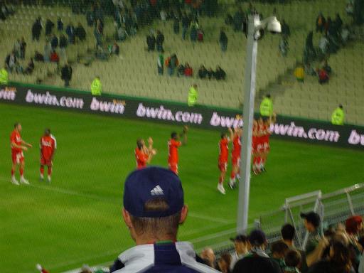 In Wenen ben ik zondagavond naar Rapid Wien-Grazer AK geweest. Leuk om eens mee te maken. Ik wist helemaal niets van het Oostenrijkse voetbal, verwachtte eigenlijk een beetje 1e divisie-idee, weinig toeschouwers, slecht voetbal. Dat laatste was zeker zo, maar dat eerste beslist niet. Zeker 15000 toeschouwers, en een sfeer die ik zelfs in Aachen vaak niet meemaak. Van 2 korte zijden kwam een enorm kabaal de hele wedstrijd. Beide zijden zaten propvol en hadden mooie sfeeracties met papier voor de wedstrijd. Liederen waren best bekend die ze zongen, hoor ze in Duitsland wel vaker.
