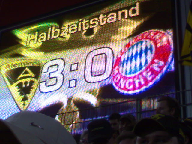 Wát een avondje zeg. Ongelofelijk. Vooraf had ik zoiets: als het maar een beeetje spannend wordt. Niet dat het met rust 0-3 staat ofzo.. Had met 3 dubbel dik ingepakt, maar dat was niet nodig. Het was wel steenkoud, maar Aachen speelde dusdanig goed dat ik met rust het zweet van mijn voorhoofd moest halen. Ongelofelijk, 3-0!! Mooie vrije trap van Reghecampf, die daarna al in eerste instantie ook al de 2-0 moet maken en het dan alsnog doet en 5 minuten later 3-0.. Ik vraag me af hoe lang het geleden is dat het grote FC Bayern met rust met 3-0 achterstond.. In de 1e minuut na rust meteen 3-1 door Podolski en ik zag de bui alweer hangen. Aachen kwam er echt niet meer uit en Van Bommel maakt fraai 3-2. Zou het dan toch?! Nee dus, de beste speler van de Bundesliga van de 1e competitieronde beslist in zijn eentje de wedstrijd, 4-2. Een enorm feest barstte los. Bayern droop af en Aachen vierde tot lang na de wedstrijd door. 3 jaar geleden bezorgde Aachen Bayern al een enorme kater door ze als 2e Bundesligaclub te verslaan. Daarna bleef FC Bayern 14 bekerduels op rij ongeslagen (2x Pokal-winst), en nu vliegen ze er weer uit tegen Aachen. Absoluut geweldig