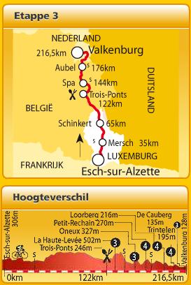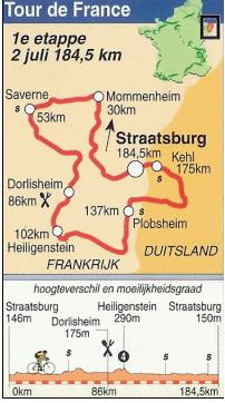 Maargoed, omdat we er zo gek op zijn en toch wel weer gaan zitten kijken nu wat over de Tour zelf. Te beginnen met de proloog vandaag in Strasbourg. Dinsdag komt de tour (via een etappe rondom Strasbourg en eentje naar Jeunesse d'Esch) naar Nederland. De finish ligt in Vilt, een kleine kilometer vanaf de top van de Cauberg. Dat beloofd een mooi slot te worden. Pas in de 2e week komt, na een individuele tijdrit, het hooggebergte eraan te pas, te beginnen in de Pyreneeën, en na wat overgangsetappen de Alpen.