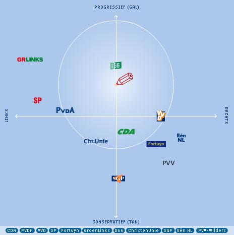 dat is wel waar. als je heel 'links' denkt over europa (zoals d66) en heel 'rechts' over defensie (zoals 1NL en fortuyn) kom je ook op cda uit terwijl je het dan in geen enkele stelling eens bent met cda