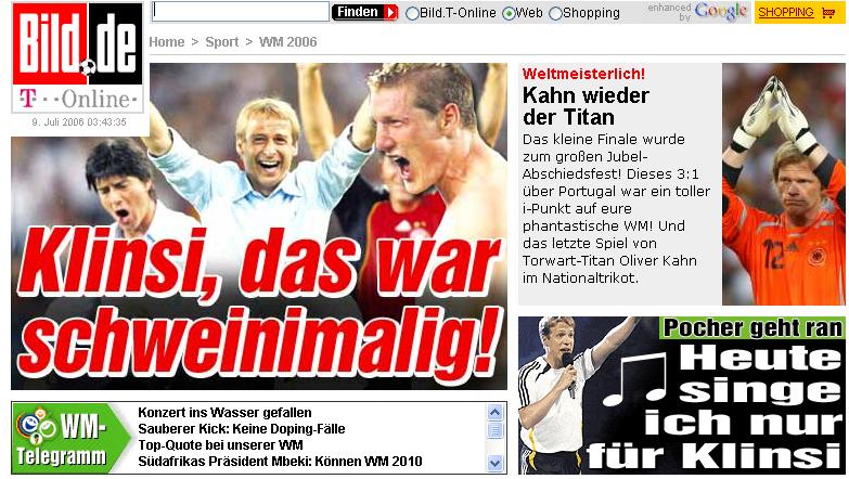 Zijn aanstelling als Bondscoach zorgde er dus voor dat Bild weinig meer te schrijven had van Klinsmann verbood zijn spelers één en ander. Na de geweldige prestaties op dit WK heeft echter Bild de handoek in de ring gegooid en is men ook helemaal om. Toch opvallend weer wat een invloed media op mensen kan hebben..